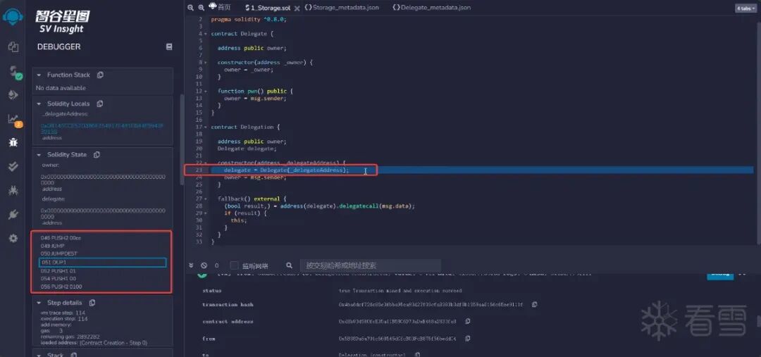Deletegation合约部署的交易Hash丢到调试器里,先从合约创建开始分析。000 PUSH1 80
