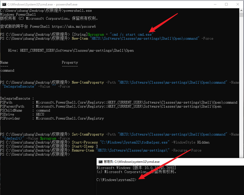 基于此原理,在poweshell下,依次执行以下代码,即可绕过UAC获得system权限。