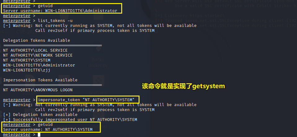 同理,在cmd窗口下,依次执行以下命令,即可获取system权限。