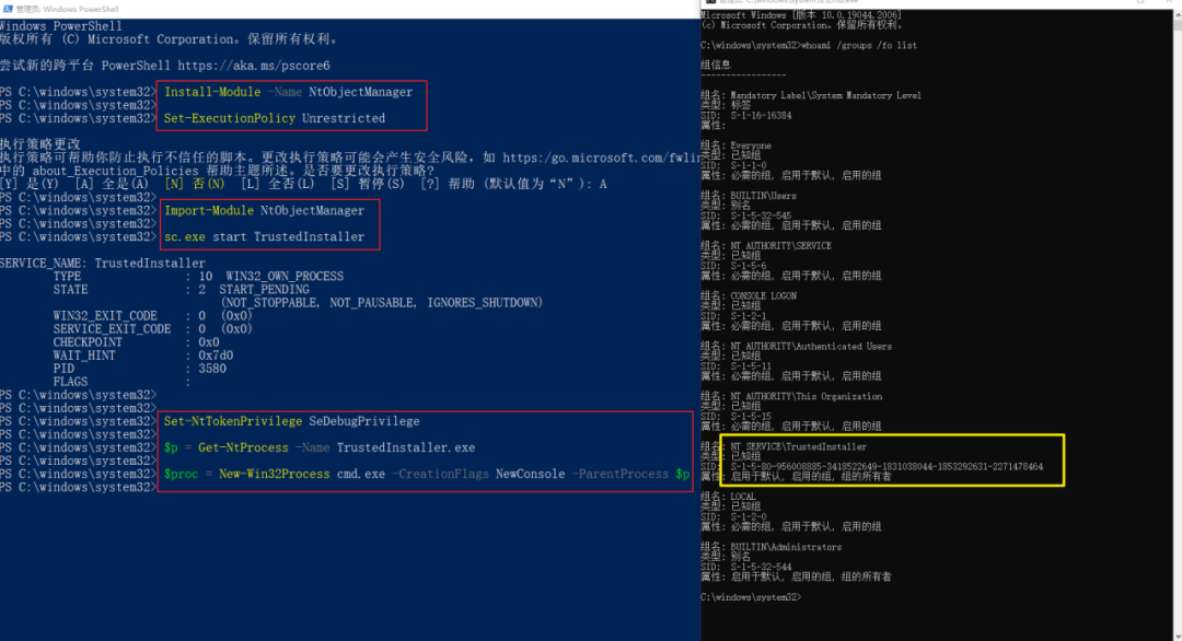 Import-Module NtObjectManager在powershell中依次输入以下命令获取TrustedInstaller权限