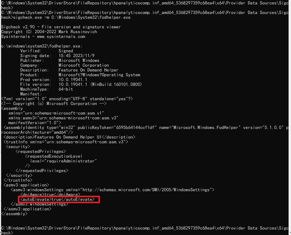 这些程序拥有一个manifest文件,该文件本质上是一个XML文件,用于标识该程序的配置属性。如果程序manifest文件中的配置属性autoElevate为True,并且该程序还具有微软签名,那么这个程序将具有一定的特权,可以绕过UAC提示框直接以管理员权限运行。