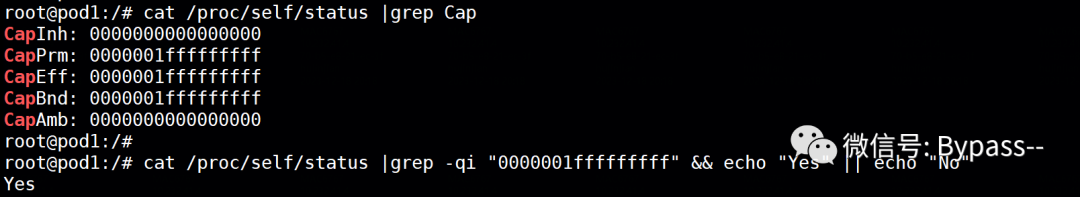 在容器中可以使用命令检测当前容器是否以特权容器启动,CapEff对应的掩码值在centos中为 0000001fffffffff ,在ubuntu中为0000003fffffffff。