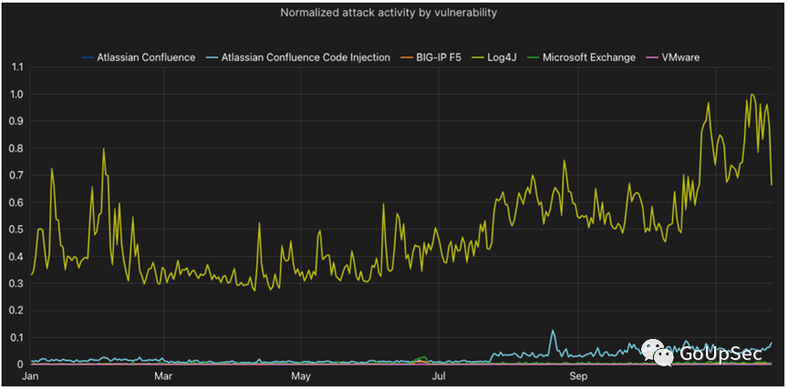 根据Cloudflare本月发布的报告,2023年全球范围内针对Log4j的攻击量始终远超其他漏洞(上图),并且在10月最后一周和11月中下旬还出现了新的高峰(法国、德国、印度和美国的log4j漏洞利用最为活跃)。