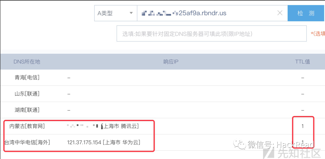 下面生成了一个地址,可以用https://tool.chinaz.com/dns/查询一下,在结果中可以看到不同的地区查询出来的最终解析地址是不一样的,一个是我的vps地址,另一个是题目的docker.ip。并且这里的TTL都为1。