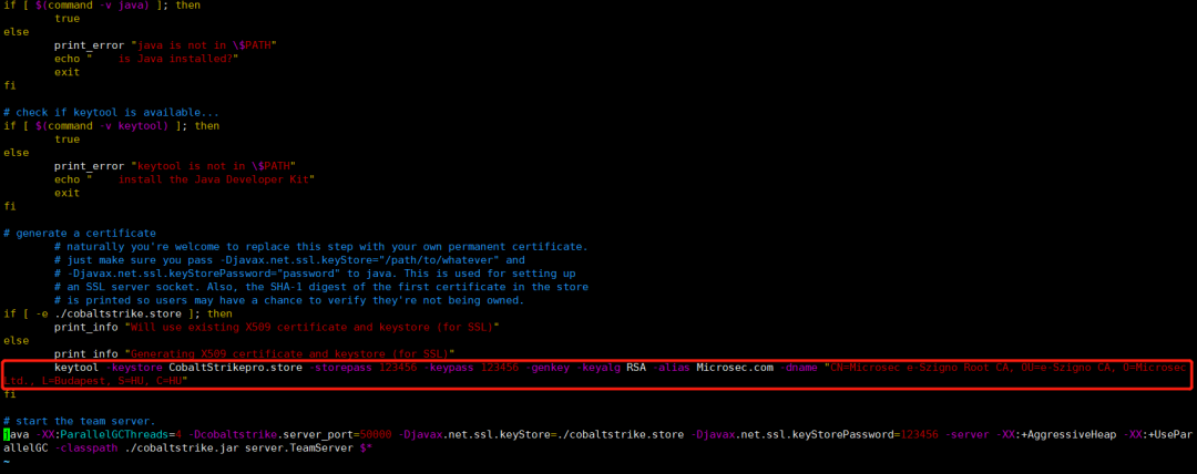 keytool -keystore cobaltstrike.store -storepass 123456 -keypass 123456 -genkey -keyalg RSA -alias Microsec.com -dname "CN=Microsec e-Szigno Root CA, OU=e-Szigno CA, O=Microsec Ltd., L=Budapest, S=HU, C=HU"