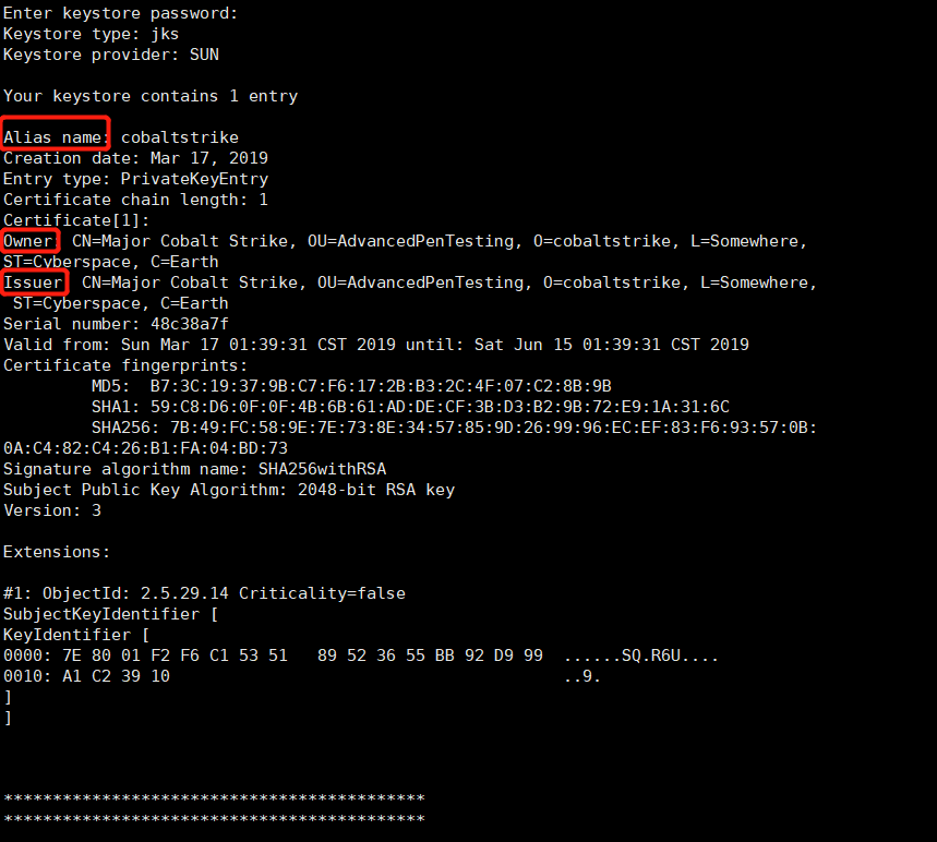 可以看到未修改的证书还是有很明显的cs特征的,比如 Alias name、Owner、Issuer字段