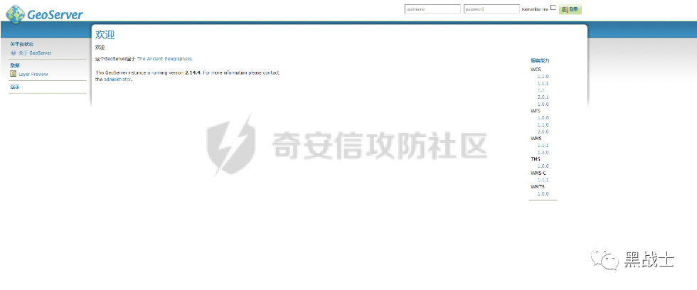 8085端口geoserver,进入登陆页面,使用默认账号密码admin/geoserver成功登录后台。