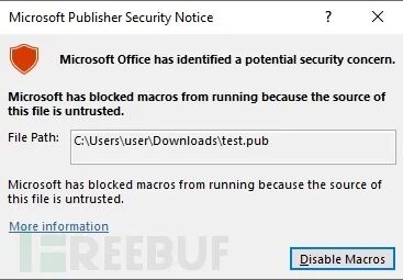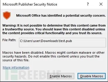 请注意不同之处,当文件附带MotW(来自Internet)时,用户现在没有选择“在.pub文件中运行宏”的选项,这使其对最终用户来说是安全的。
