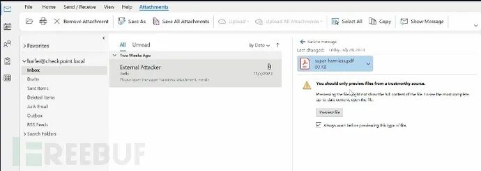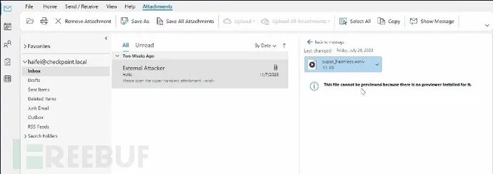因此,在典型的企业环境中检查Outlook上的攻击向量是必要的,这也是Check Point研究团队开展此项研究的初衷。在此项研究过程中,Check Poin研究人员以一个普通用户的身份点击和双击Outlook上的内容,来完成日常工作所需的操作,并从安全研究的角度来检查这些操作可能带来的安全风险。