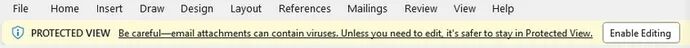 再举一个例子,对于场景2.1.3(双击打开附件),如果我们假设攻击者有一个Word漏洞,可以在正常模式下工作,而不是在Microsoft Word的“受保护视图”模式下工作——事实上,这是最常见的基于Word的攻击。如果攻击者(从外部来源)将漏洞利用作为电子邮件附件发送,为了获得成功的利用,受害者不仅需要在这种情况下执行一次双击,还需要在Microsoft Word上执行一次额外的单击(用于“启用编辑”按钮,见下图),以退出非常严格的“受保护视图”(Protected View)模式。因此,如果我们考虑完整的攻击链,则交付典型的基于word的漏洞利用总共需要两次用户点击。