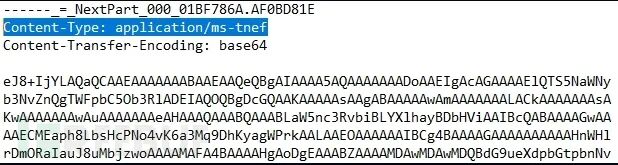 下图是TNEF格式电子邮件的一个示例,注意字符串“Content-Type: application/ms-tnef”,它指定该电子邮件遵循TNEF格式。