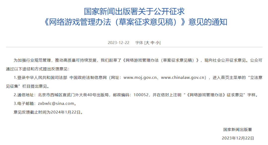 11点30左右,A股刚刚进入”午休“,国家新闻出版署发布《网络游戏管理办法(草案征求意见稿)》,向社会公开征求意见。