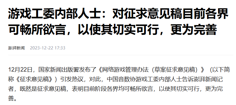 上海报业旗下的澎湃新闻找了游戏工委的内部人士,借他人之口,表示对本轮游戏管理办法的意见稿,可以”畅所欲言”。