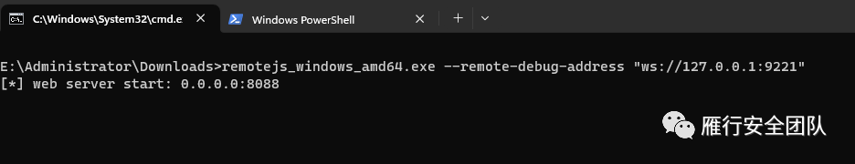 然后点击运行remotejs_windows_amd64.exe 加上 --remote-debug-address "ws://127.0.0.1:9221"参数连接到我们刚才打开的浏览器