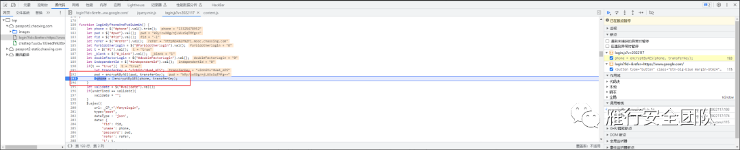b.直接在登录数据包的启动器中选择submit那个链接,可以直接定位到数据包发送相关函数代码,然后再在函数调用栈中进行追溯寻找,寻找过程多打几个断点看作用域里的代码变量参数变化来不断逼近加解密函数的大概位置。