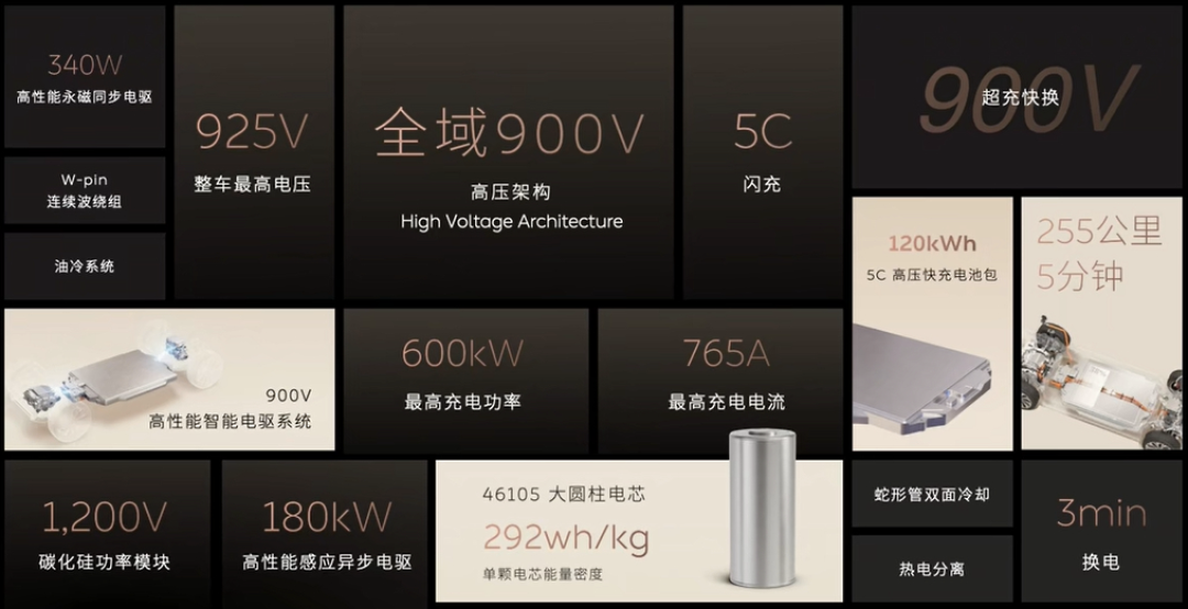 3. 仅电池支持 800V 高压快充,其它部件均为 400V。车企之所以会把自家的旗舰车型升级到高压平台,一是大幅提升了充电补能的速度,二来高压平台相比传统的 400V 平台,在一定程度上可以降低车辆各个零部件的能量损耗,从而提升车辆续航。和一些喜欢搞「语言艺术」的车企不同,蔚来 ET9 所有核心高压元件,如电池、电机、线束、空调、DC-DC、⻋载充电机等的最高带宽,都达到了 900V。蔚来认为,将带宽上限拓宽至 900V,可以带来更⾼的系统效率、更极致的性能输出、更⾼的安全标准、更优的综合补能体验。比如 ET9 上专为 900V 定制的碳化硅电机,就能很好地体现出高压平台的优势。这台新车仍保持了蔚来双电机的传统,前电机为 180kW 感应异步电机,后电机为 340kW 永磁同步电机,其中,后电机的最⾼转速突破了 20000 转,峰值扭矩达到 5000N·m。整套系统的综合功率达到 520kW,也就是近 700 马力。ET9 所用的 NT3.0 高压平台的另一个亮点,是其充电速度。发布会上介绍,ET9 的 120kW 电池的充电峰值功率可以达到 600kW,峰值电流也能去到 772A,做到了充电 5 分钟,续航 255 公里。另一方面,蔚来也在快充配套设施上下了些功夫,全新发布 640kW 液冷快充桩和第四代蔚来换电站。其中,第四代蔚来换电站的电池仓位增加至 23 个,单次换电速度缩短了 22% 的时长。同时,500V-1000V 快充桩都覆盖了升压充电功能,不同平台的车子都可以在同一个桩上充电,不必特意寻找与车辆匹配的充电桩。除了上述的高压平台设计,电池本身的性能也是影响整车充电速度快慢的主要因素。蔚来电池系统副总裁曾士哲认为,面向 900V 的动力电池,应该具有低内阻、低能耗、充电快、安全性、更轻薄、低温长续航等的优势,在这种「全部都要」的要求下,蔚来⾯向 900V ⾼压平台,专门研制了超充⼤圆柱电芯和电池包。这是一款集成「高压+超充」的电芯,如此布局和设计,能让电池的能量密度变得更高、性能更强,安全性也更有保障。以上,就是 2023 NIO Day 上关于 ET9 的所有信息,回头看看这辆新车的配置、定位以及 80 万元的预售价,不难看出它注定会成为又一款没法「卖爆」的蔚来车型。 销量一直都不是豪华车型的主旋律,而如何做好一款豪华车型,会直接影响一个品牌的豪华调性,这是许多新型品牌共同面对的难题,也是传统车企如今依然能保持销量的秘诀。 我们将车辆的豪华感,总结为三点:各大品牌在前两项上的表现,都还不错,但在「增值」部分的探索,蔚来显得更有特色,他们将用户的增值体验分为了两大板块 —— 服务与换电。 发布会上李斌用略带疲惫又有些自豪的声音告诉我们,蔚来目前已经建成了 2309 座换电站,明年还会继续疯狂的「千站计划」,到 2024 年底,预估建成总数为 3310 座。 爱范儿 2024 招聘 | 在一个创造力爆棚的公司成为超级个体