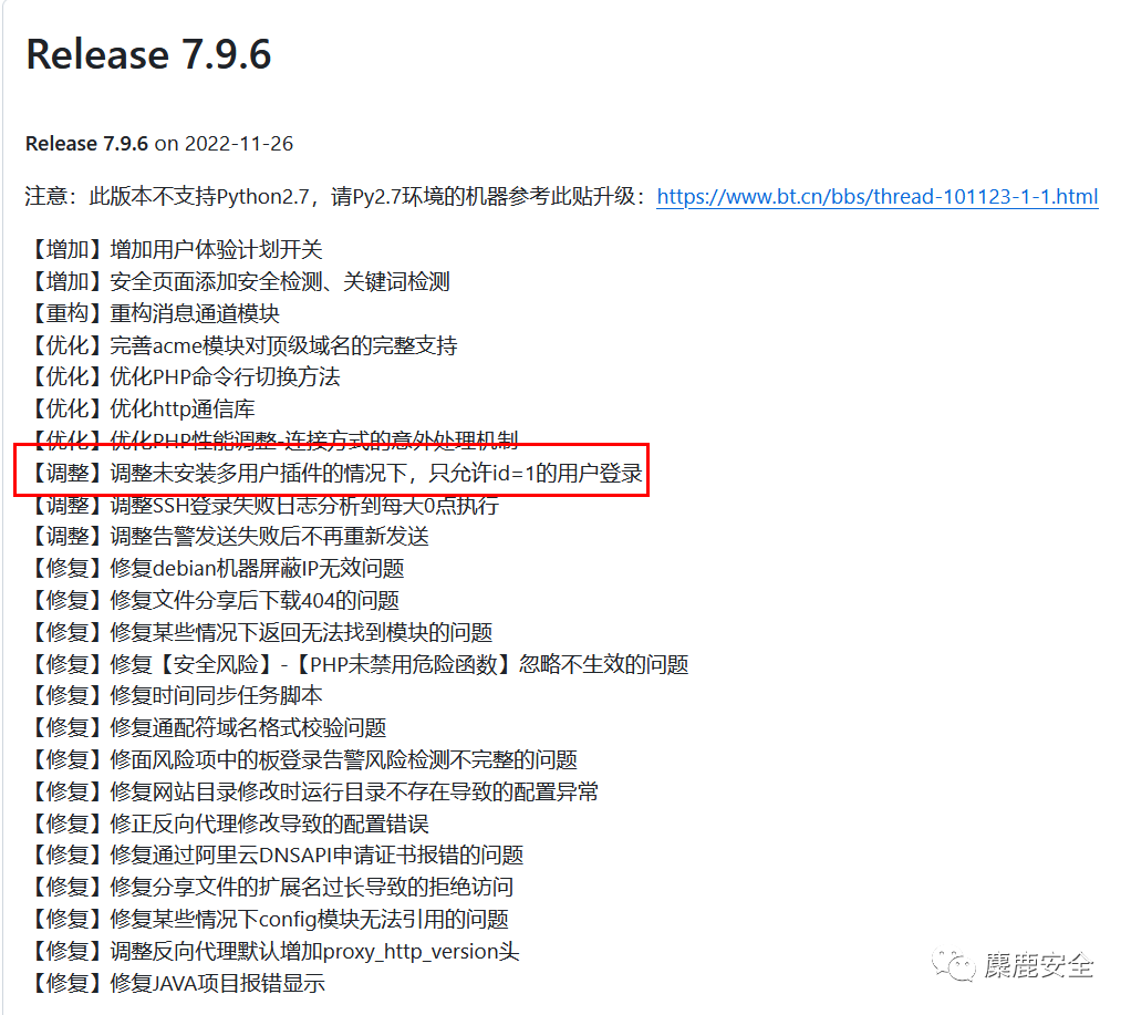 先来看一下github上宝塔的更新日志,7.9.6里提到做了限制只允许id=1的用户登录