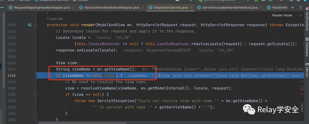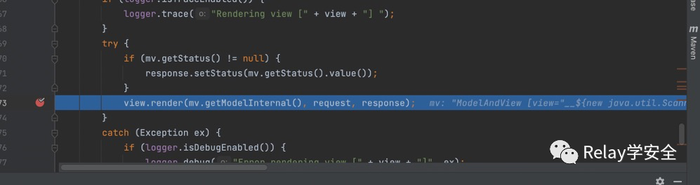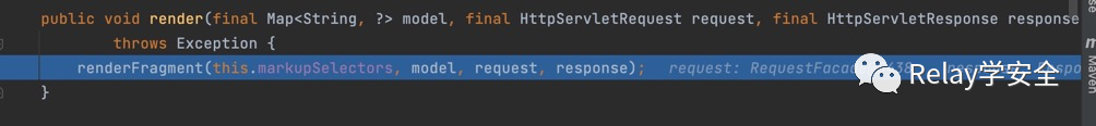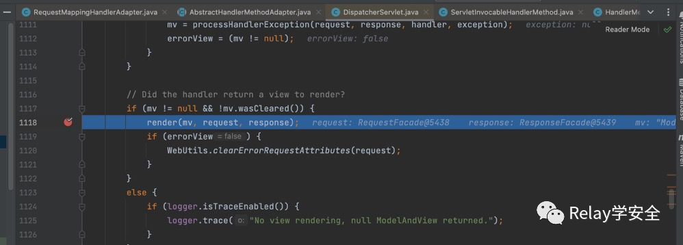 我们跟进去,紧接着跟进render方法,将我们的modelandview传进去,也就是mv。