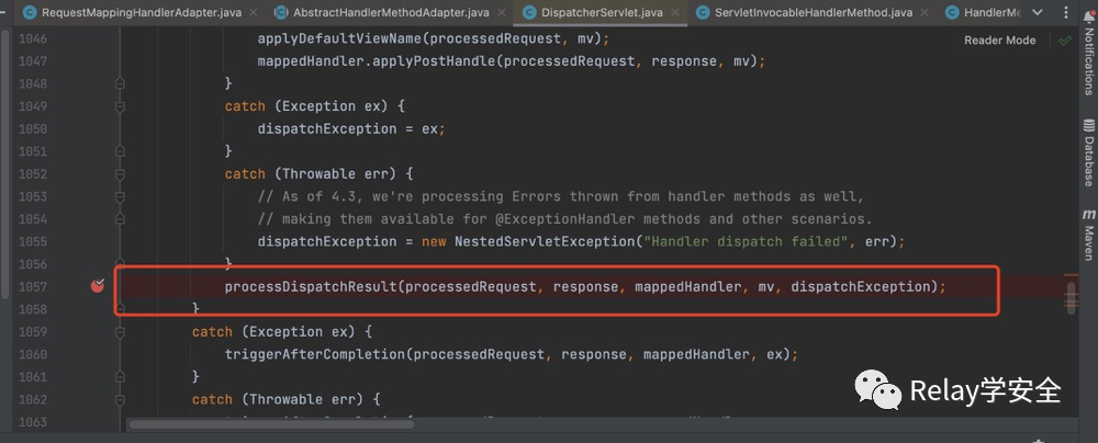 我们首先定位到doDispatch方法,在dispatchServlet类里面,可以参考我前面写的SpringMvc分发处理。