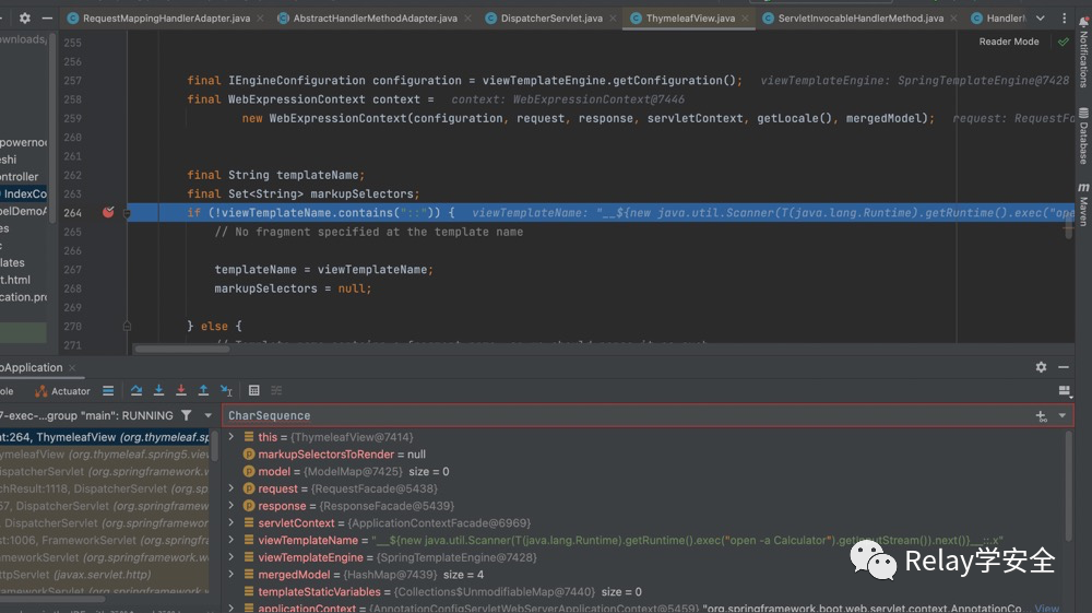 首先首先getViewName方法,获取到我们的视图名称,紧接着调用getView方法获取视图解析器,可以看到这里获取到的视图解析器是thymeleafview,我们跟进render方法。