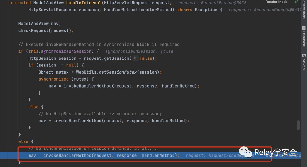 我们来到handleInternal方法 前面是一些无关紧要的 主要看invokeHandlerMethod处理方法这里传进去三个参数 一个是request请求参数 response响应参数 handlerMethod参数。