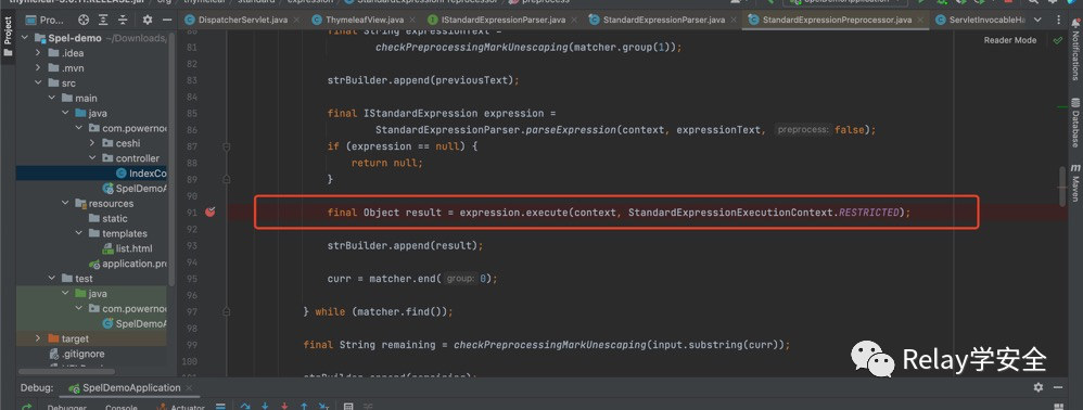 然后调用execute执行,跟进execute最终调用org/thymeleaf/standard/expression/VariableExpression#executeVariableExpression使用SpEL执行表达式,触发任意代码执行。