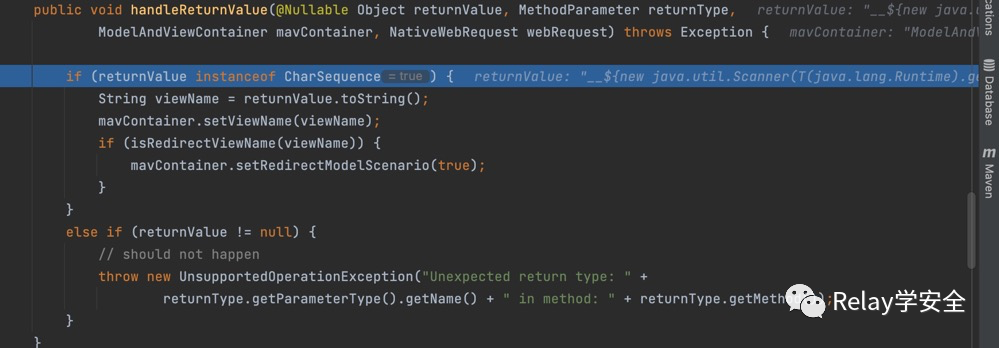 我们跟进去,首先他判断我们的returnValue是否是CharSequence的实例,然后紧接着调用isRedirectViewName方法判断,我们是否是以redirect:开头,如果是的话设置重定向。然后回到invokeHandlerMethod方法。