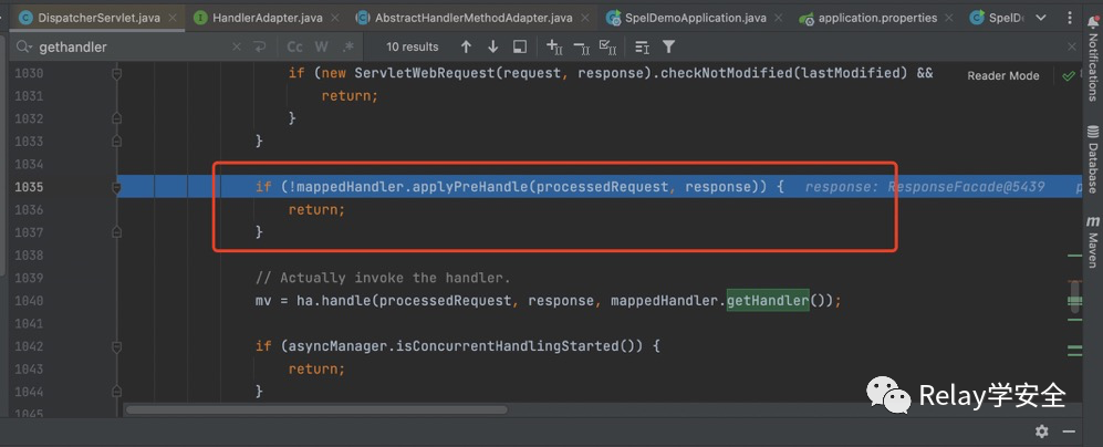 到这里我们的Controller和方法名已经被读取到了 ,然后下面进行循环 此时的mapping就是我们的基于注解的映射 然后拿到了handler 进行返回,我们回到doDispatch方法。