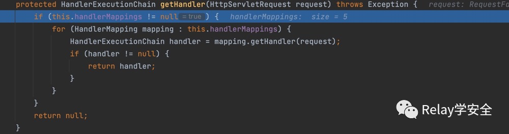 来到getHandler方法。首先判断我们的handlerMappings是否等于null,这里的handlerMappings是我们springmvc的9大初始化对象,我们可以发现他是一个List集合,他是在我们的initHandlerMappings方法中进行初始化的。