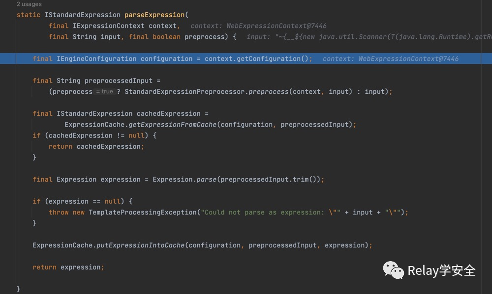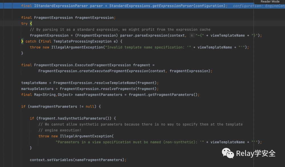在else分支里面,当viewTemplateName中包含::时,thymeleaf会认为其是一个要处理的片段表达式,会给其加上~{}然后进行解析,我们跟进parseExpression尽进行处理。