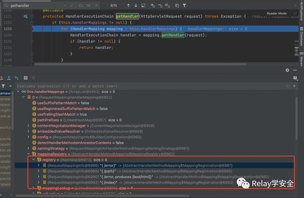 回到getHandler方法之后, 通过我们上面分析得知handlerMappings中存储着我们的controller以及controller的映射,他是以key=>value的形式进行存储的。