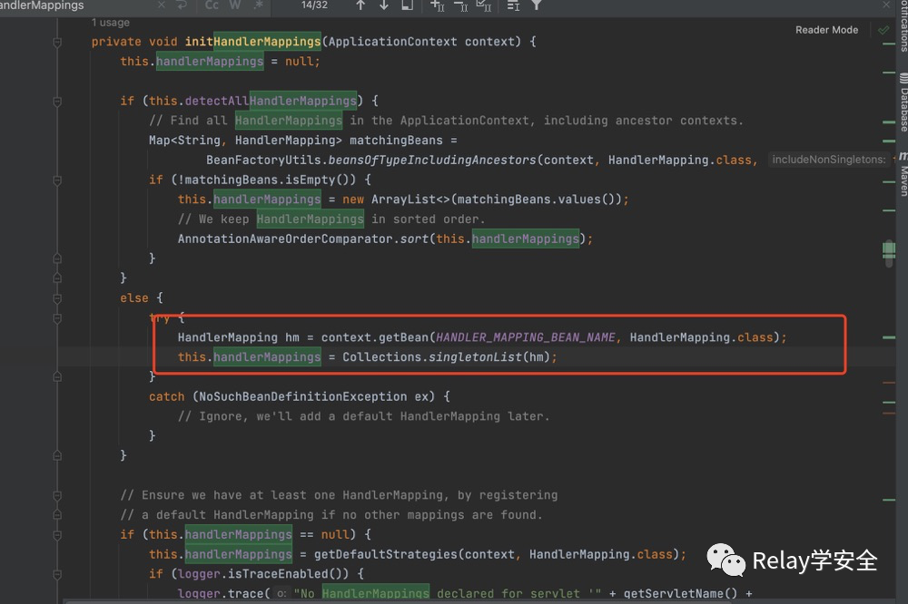 然后来到initHandlerMappings方法内部,这里调用GetBean方法 从我们的spring容器中拿到handlerMapping类,这个类型代表我们的controller 这个类型中有我们的controller 以及 我们controller的映射。接着回到我们的getHandler方法。