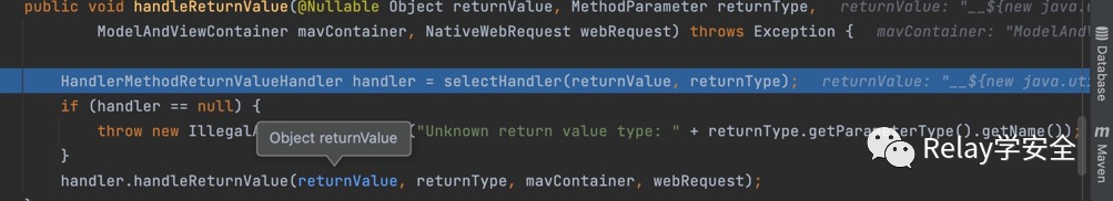 紧接着调用handleReturnValue方法,首先获取到returnValue的处理器也就是handler,然后调用handleReturnValue对returnValue进行处理。