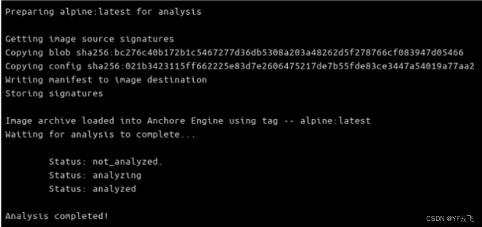 一旦引擎运行,目标 Docker 镜像将被拉取和分析。然后,您将看到终端中显示的安全报告。该脚本将通过清理环境并停止 Anchore Engine Docker 容器来完成。