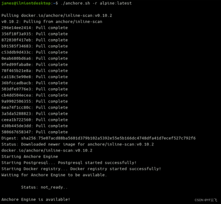 第一次扫描可能需要一段时间。该脚本将拉取 Anchore Engine Docker 镜像,启动一个新的 Anchore 实例,并配置 PostgreSQL 和一个 Docker 注册表实例。然后它会等待锚定引擎启动。