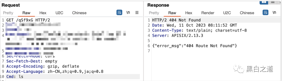 如图使用了apisix网关的WebServer在用户访问不存在的路由时,会抛出如下错误,这可以作为我们指纹识别的特征所在