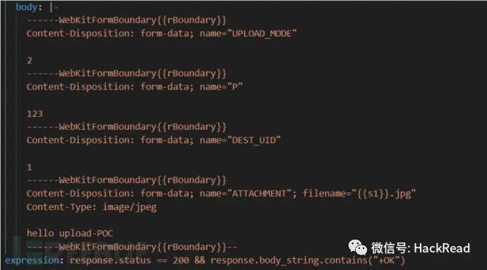 分别对应了4个参数和上传表单构建,在"{{}}"这两个花括号代表了引用set设置好的随机值,后面的s1同理,expression用于调用并获得rule对应结果用的,这里可以理解为只有http状态为200和出现+OK字符才算漏洞验证成功