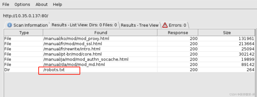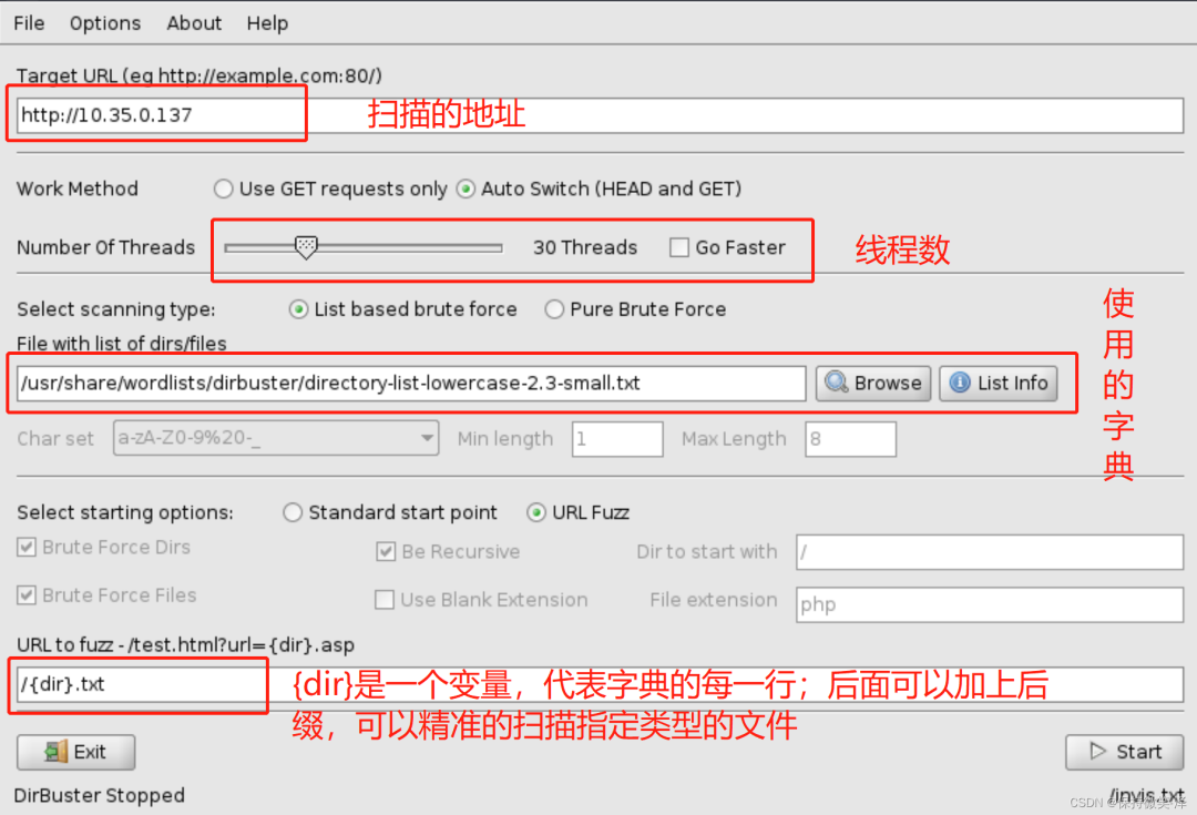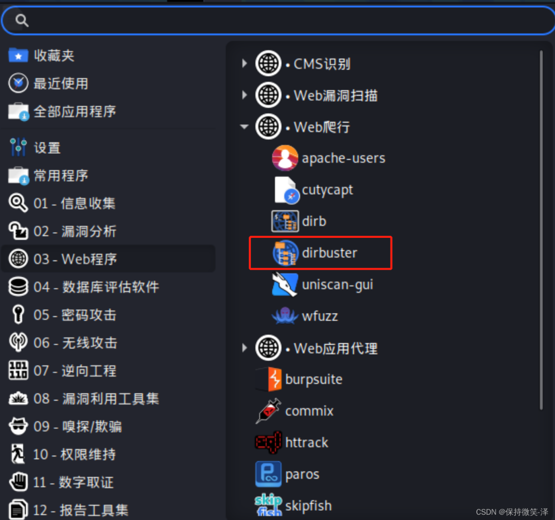 dirb http://www.baidu.com/ -z 100DirBuster目录扫描工具支持全部的Web目录扫描方式。它既支持网页爬虫方式扫描,也支持基于字典暴力扫描,还支持纯暴力扫描。这个软件kali系统自带有,我们可以直接使用,操作也很简单。