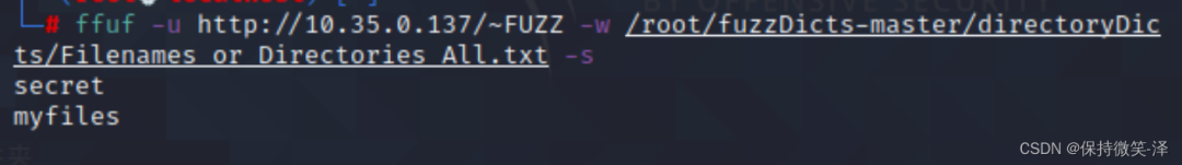 ffuf -u http://10.35.0.137/~secret/.FUZZ -w /root/fuzzDicts-master/directoryDicts/Filenames_or_Directories_All.txt -