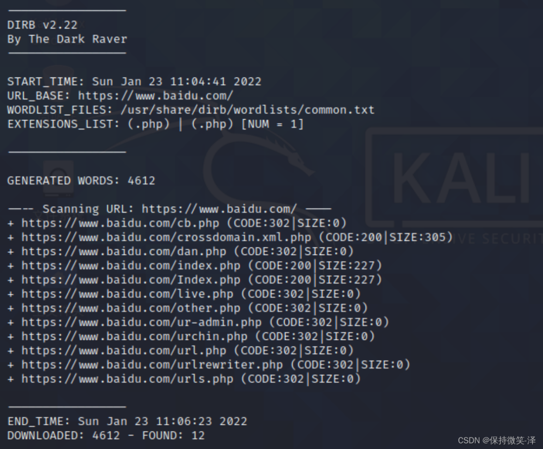 dirb https://www.baidu.com -X .php /usr/share/wordlists/dirb/big.txt如图,一共发现12个网址。打开一个网址测试一下。