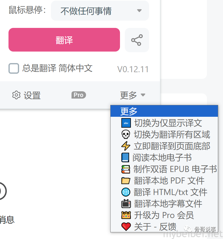 点击插件底部「更多」按钮,选择「制作双语BPUB电子书」、「翻译本地PDF文件」、「翻译THML / TXT文件」、「翻译本地字幕文件」即可。