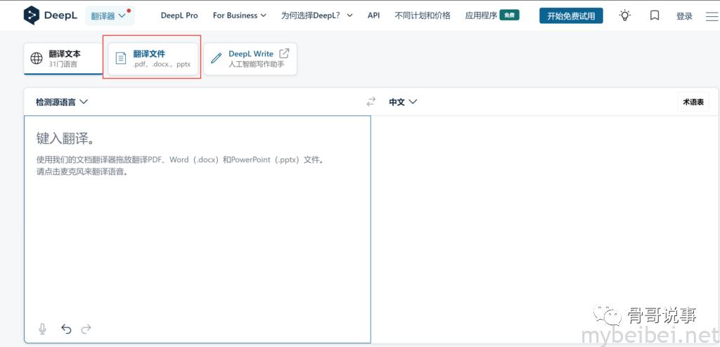 在DeepL网站上,只需点击页面上的“翻译文件”按钮,就可以上传PDF、Word、PowerPoint文件,轻松完成翻译。
