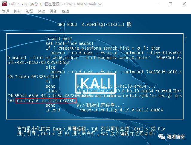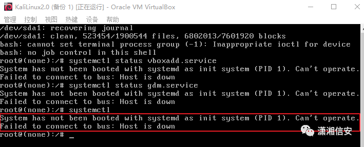 高级选项”按e键进入编辑模式,在Linux末尾处输入以下命令,再按Ctrl+X进入命令行即可,如下图所示。rw single init=/bin/bash但是按图中的报错提示执行以下命令查看vboxadd、gdm服务都失败了,启动就更不用说了,好像是不能在这个命令行下使用systemctl命令,如下图所示。